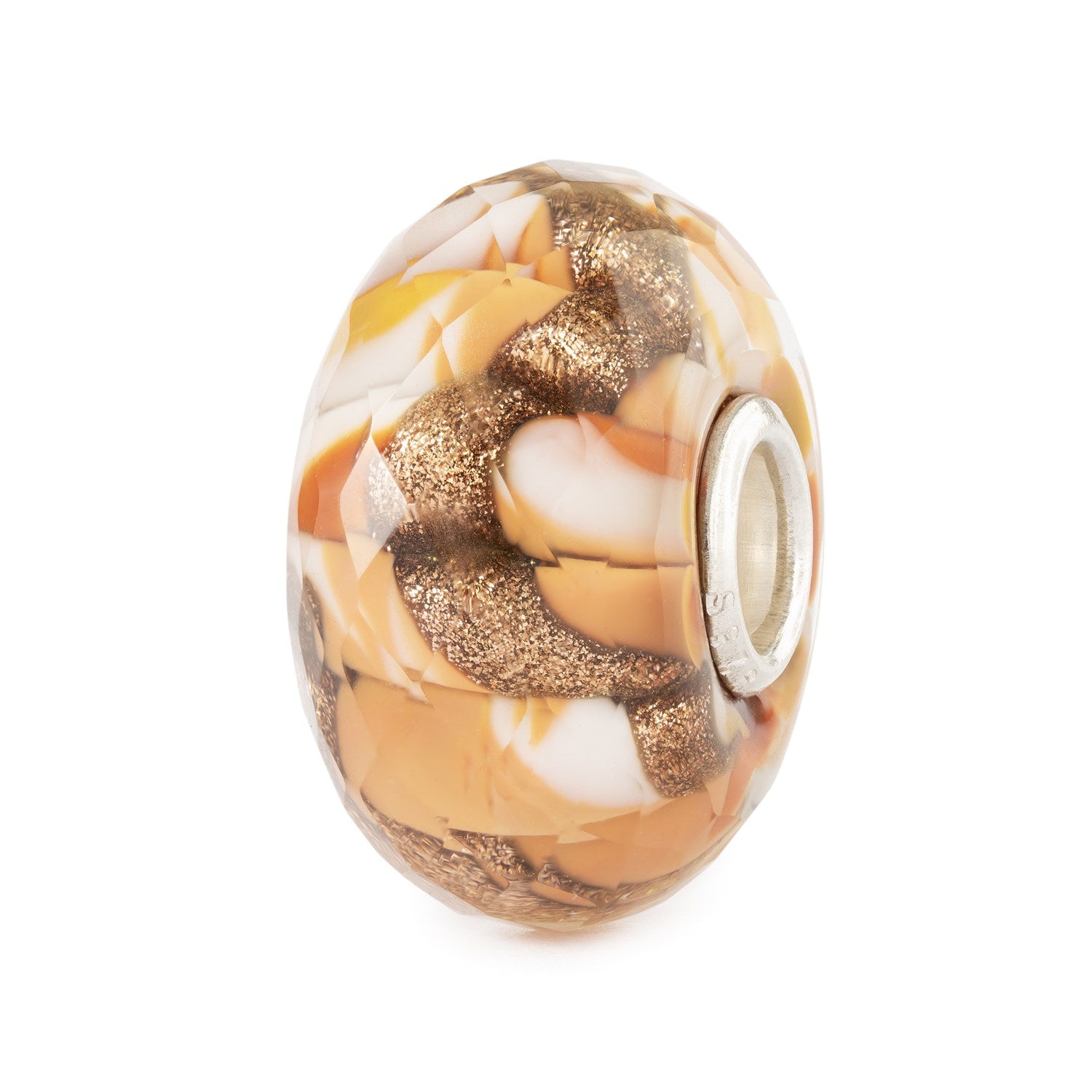Denne facetslebne glaskugle er en ægte skat med sine rige rav- og orange nuancer og glitrende gyldne glimmerspor. Glassets lag synes at bøje og folde sig, hvilket skaber et bølgende mønster, der fanger lyset yndefuldt og giver en solkysset, strålende glød. Hver kugle reflekterer lyset smukt og tilføjer både varme og gylden elegance til dit armbånd, en bangle, en halskæde eller en fantasiring.