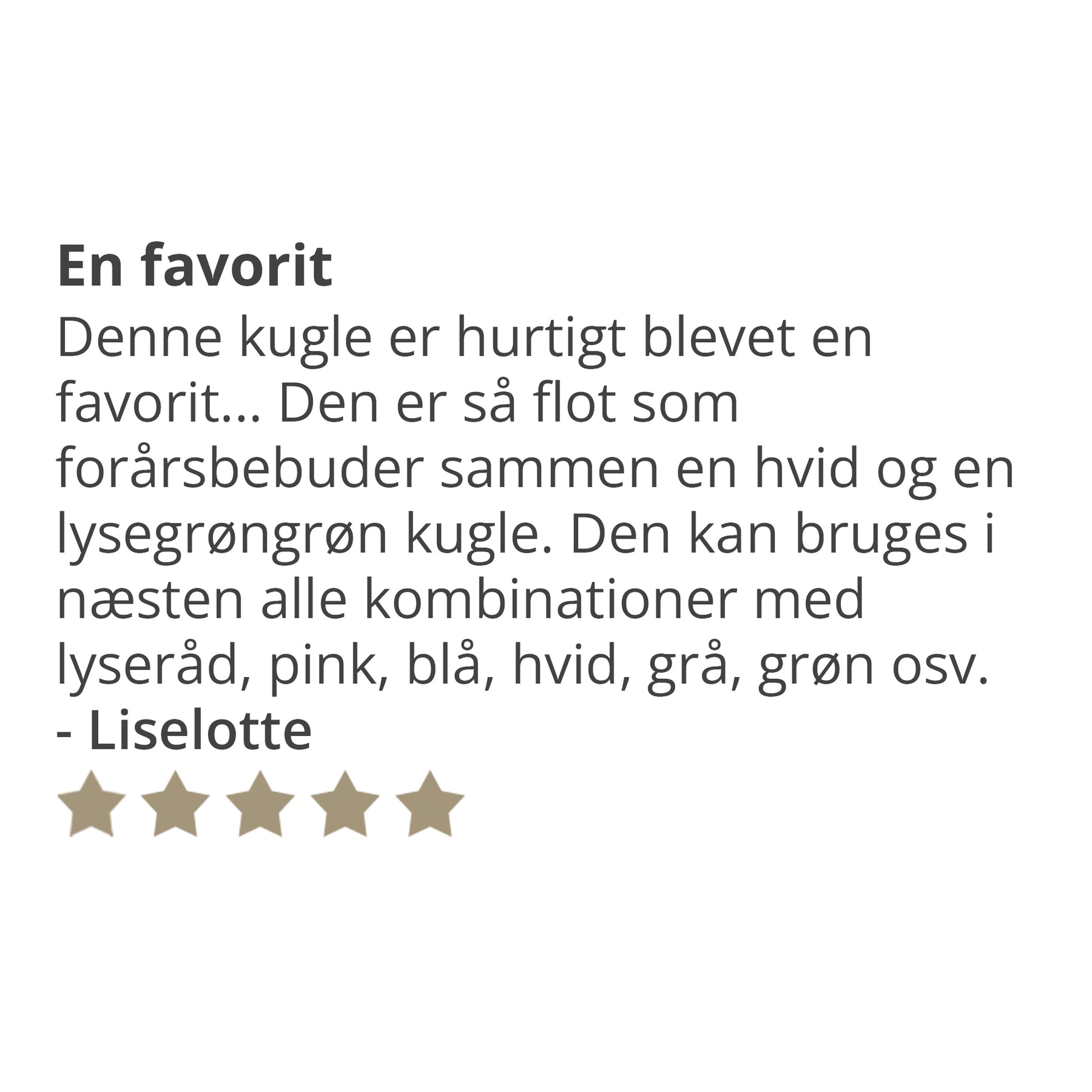 Vær opmærksom på: Glas er et fantastisk materiale. Hver glaskugle er håndlavet af rødglødende glas på åben ild, og derfor er der aldrig to glaskugler der er helt ens. Dette gælder både størrelse, farver og mønstre. Din glaskugle er fuldstændig unik og kan derfor variere en anelse fra kuglen, du ser på billedet.