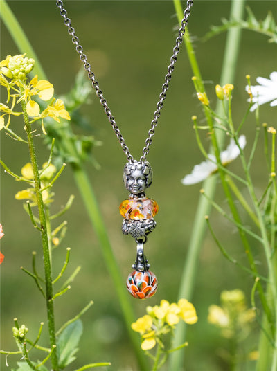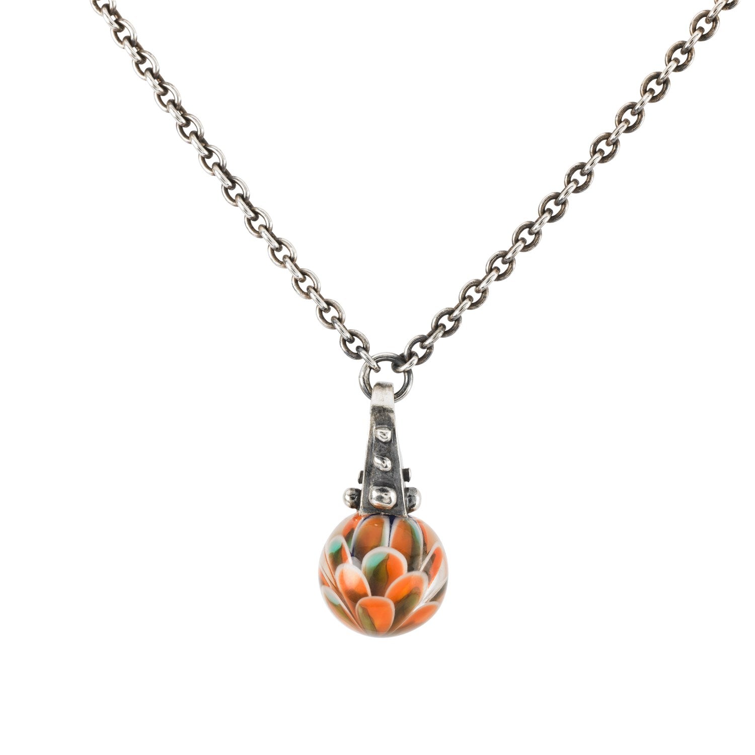 En rund glaskugle med blade i orange, grøn og blå nuancer på sølvvedhæng med bark og dråber af dug.