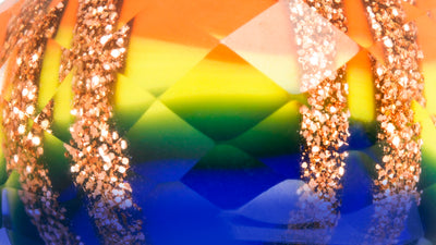 Glædens sæson er en glaskugle med en facetteret form i julefarver, der symboliserer glæden og lykken i juletiden i din smykkesamling.