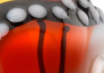 En smuk facetteret glaskugle med et leopardplette-mønster, der minder om en leopard. Pletterne er en blanding af orange og lysebrune toner på en beige baggrund.