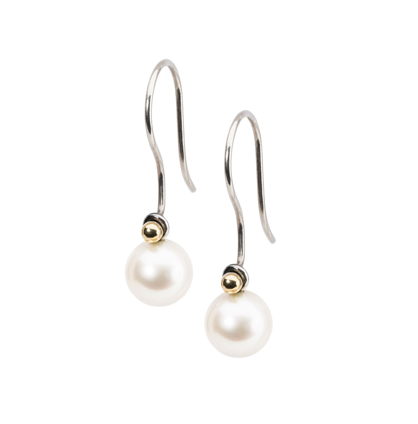 Hvide perler symboliserer uskyld, skønhed, oprigtighed og nye begyndelser. De smukke øreringe med fine hvide runde dråbe perler og sølvørekroge med guld er den perfekte gave.