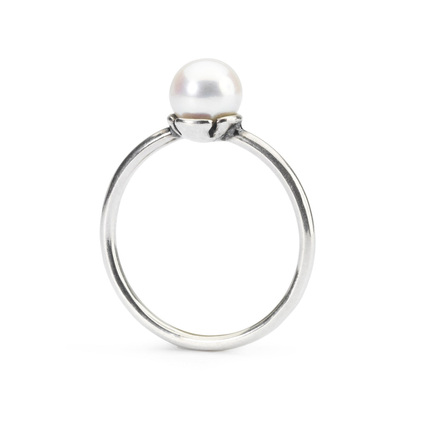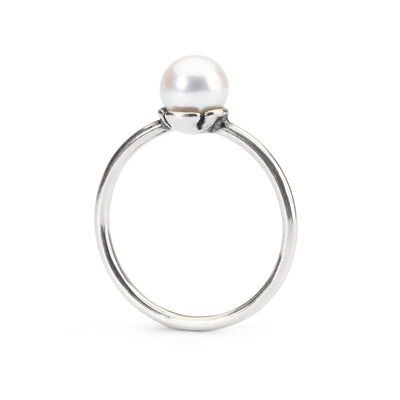 Ring med en petit hvid ferskvandsperle liggende i kronblade af sølv. Den hvide perle er et symbol på skønhed, renhed og uskyld.