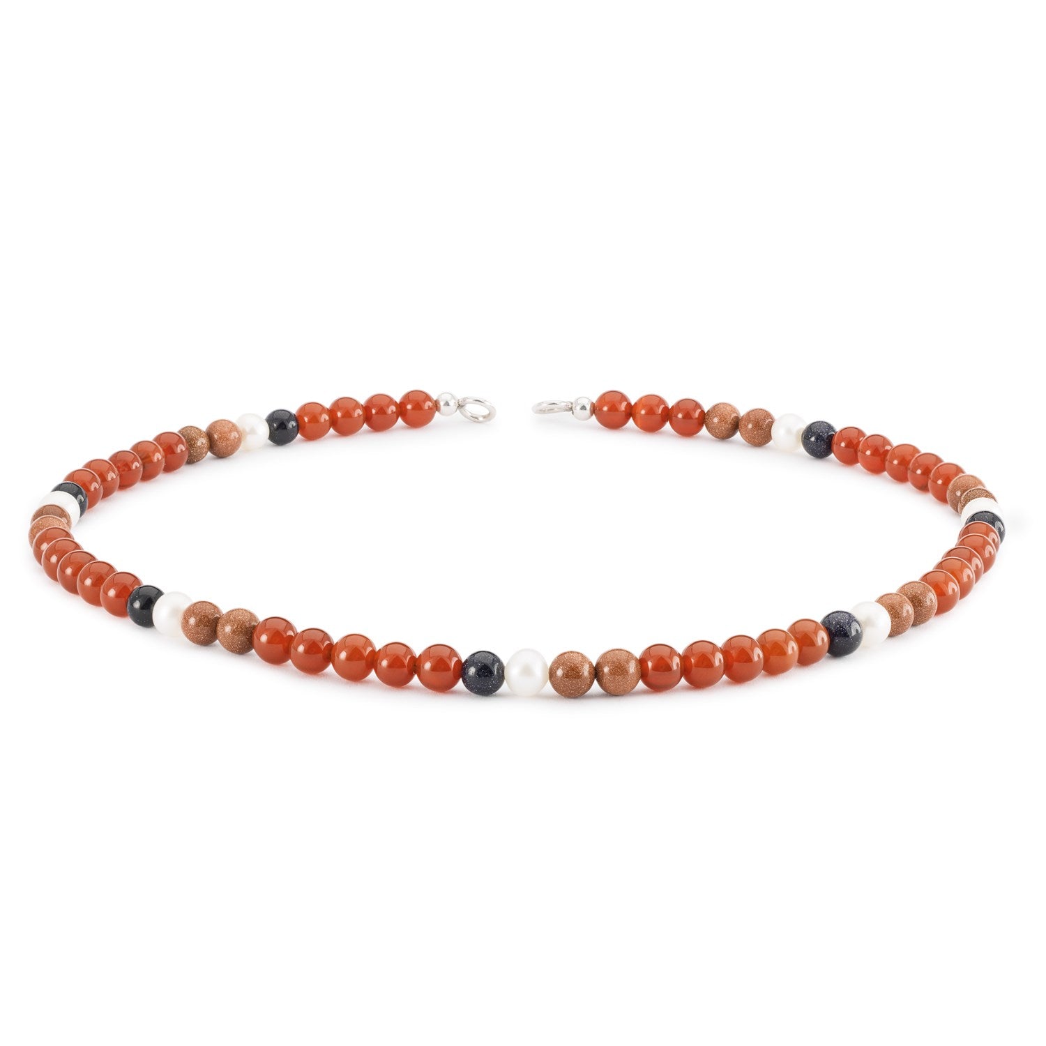 En håndlavet halskæde med brun og blå guldsten, rød onyks og ferskvandsperler. Halskæden hjælper med at genvinde energi og give dig styrke og velvære.