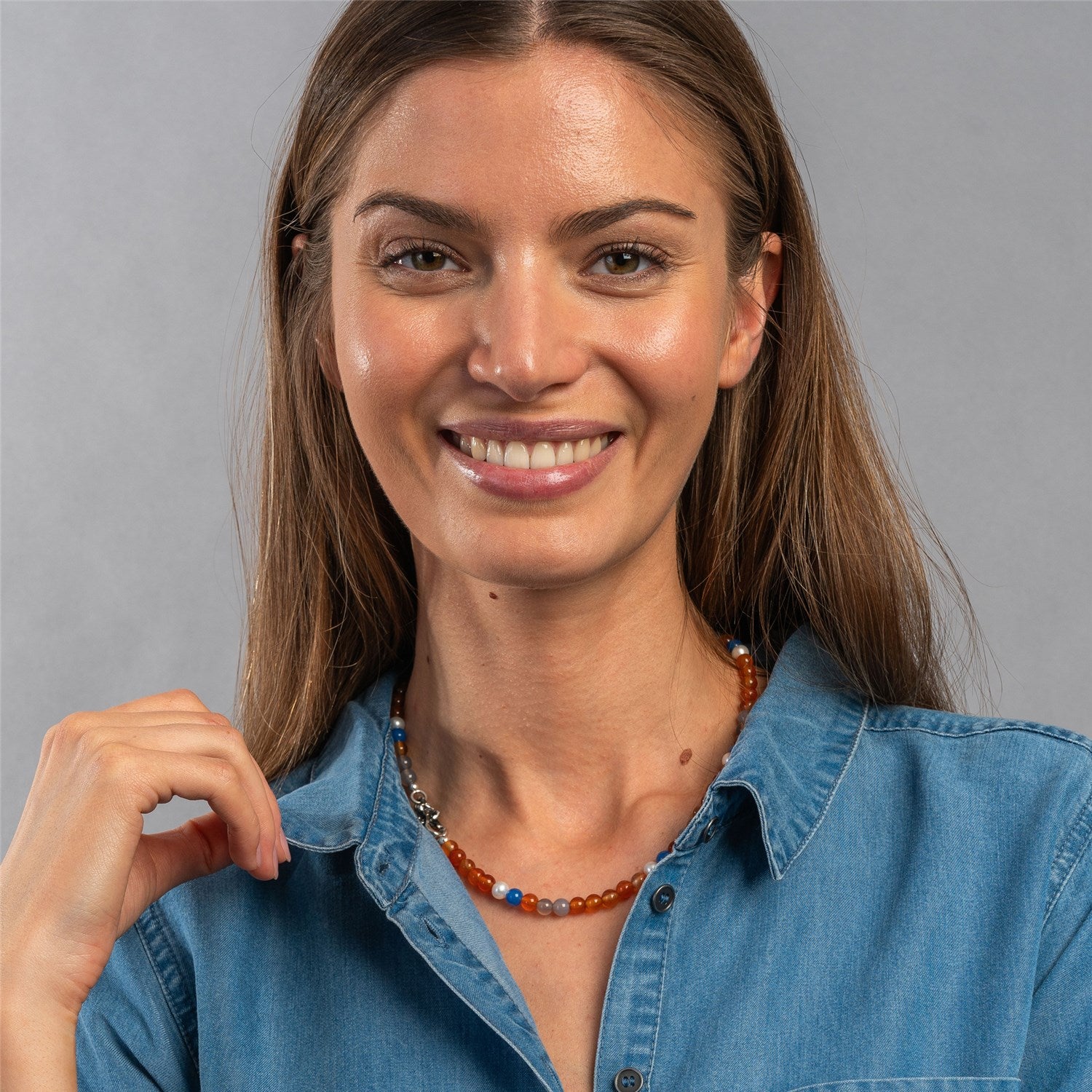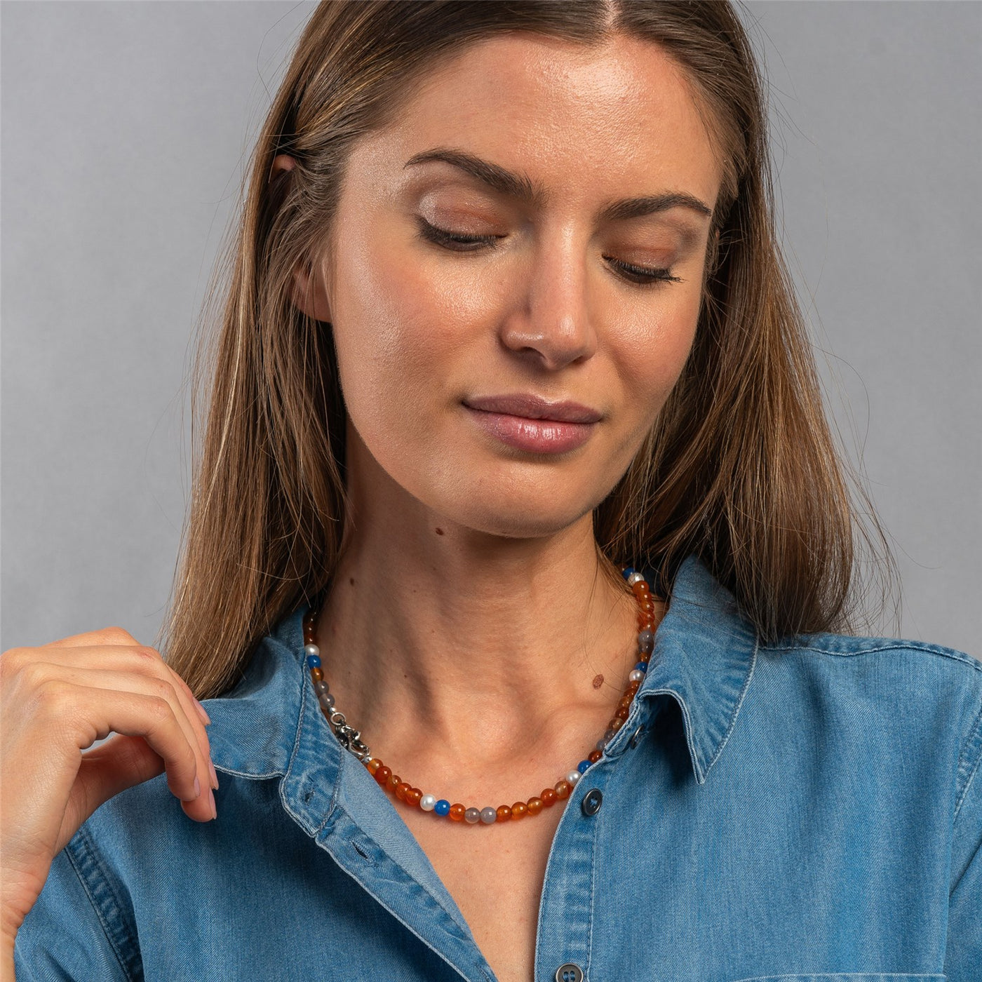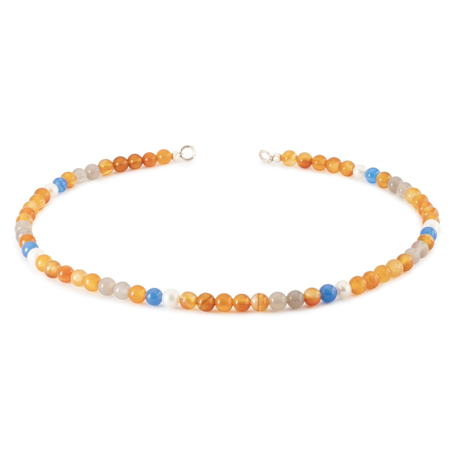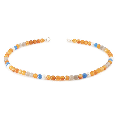 Halskæden er sammensat af hvide perler, grå labadorit, blå agat og orange karneol.